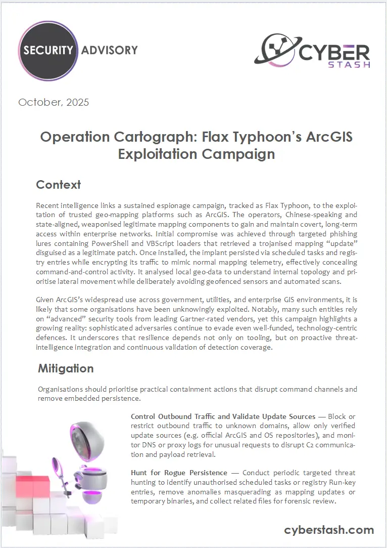 Recent intelligence links a sustained espionage campaign, tracked as Flax Typhoon, to the exploitation of trusted geo-mapping platforms such as ArcGIS. The operators—Chinese-speaking and state-aligned—weaponized legitimate mapping components to gain and maintain covert, long-term access within enterprise networks. Initial compromise occurred through targeted phishing lures containing PowerShell and VBScript loaders, which retrieved a trojanized mapping “update” disguised as a legitimate patch.